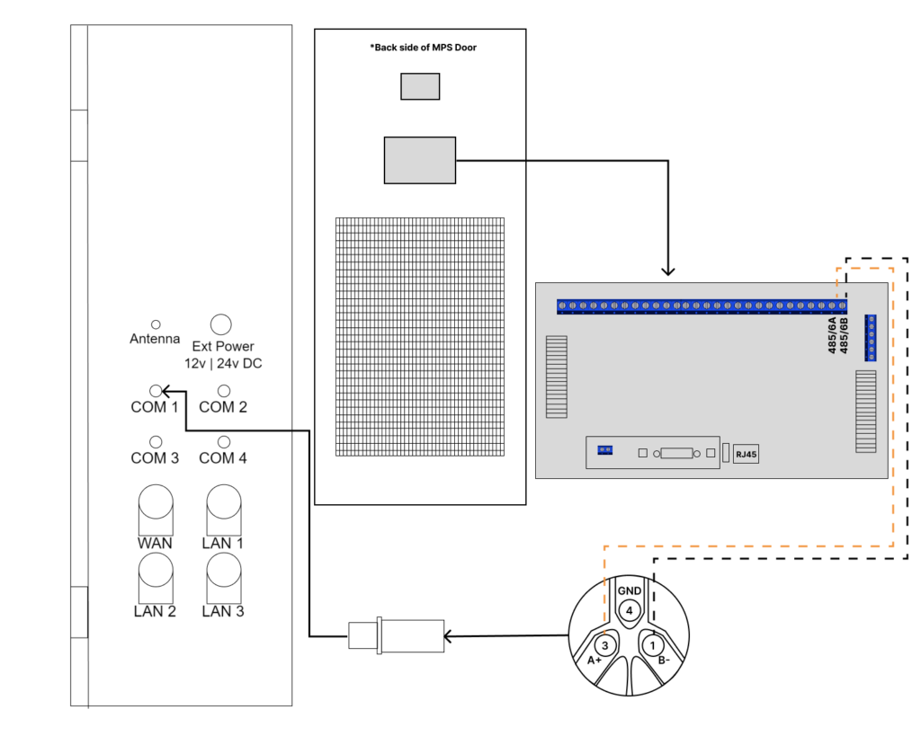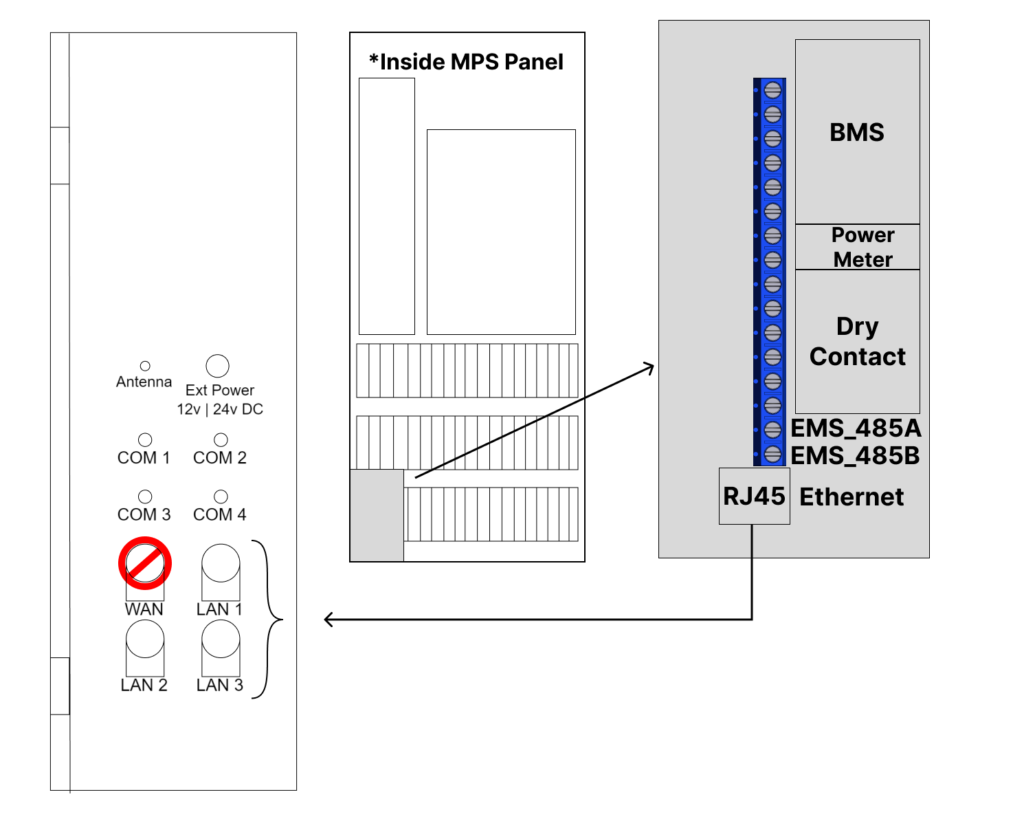 - Wire the MPS RJ45 port into either LAN1, LAN 2, or LAN 3 of the EMS Panel with a shielded CAT 5e or better ethernet cable.